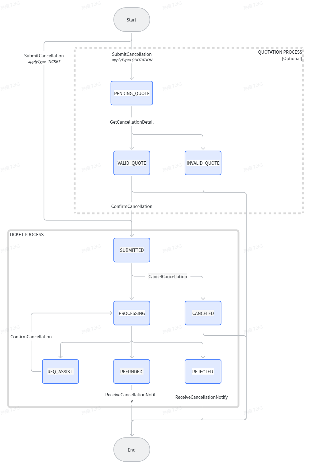 - Use [SubmitCancellation] to submit a request, set [applyType: TICKET]. The system will then generate a valid cancellation ticket and status [Cancellation Status: SUBMITTED].